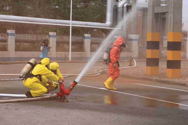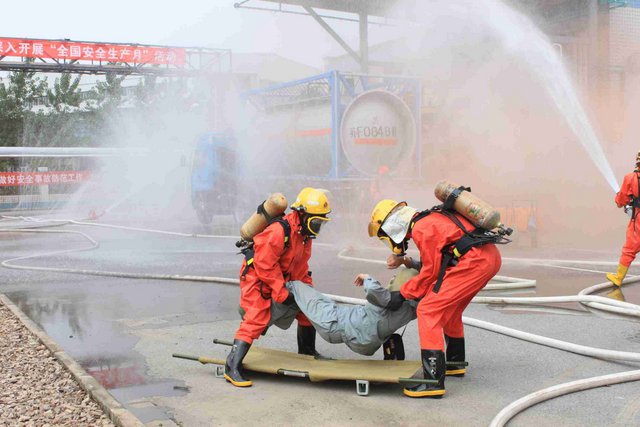 6月21日上午,9時(shí)40分,江山股份氯氣站一輛裝有20噸液氯的槽罐車(chē)在接卸液氯作業(yè)時(shí),管道“發(fā)生”氯氣泄漏,氯氣向周邊擴(kuò)散,影響了附近企業(yè)和居民的人身安全……這是南通市氯氣泄漏事故應(yīng)急綜合演練中的一幕。 由市政府主辦、江山股份承辦的南通市氯氣泄漏事故應(yīng)急綜合演練是2012年南通市安全生產(chǎn)月的“重頭戲”, 此次應(yīng)急演練重在提高政府、職能部門(mén)、企業(yè)應(yīng)對(duì)危險(xiǎn)化學(xué)品事故的應(yīng)急處置能力,最大限度減少因安全生產(chǎn)事故給企業(yè)和人民群眾造成的財(cái)產(chǎn)損失和人員傷亡。 由于氯氣是具有刺激性氣味的有毒氣體,可以溶解于水,因此應(yīng)急處理主要是通過(guò)噴灑形成水霧的方法來(lái)降低氯氣濃度,控制擴(kuò)散范圍?,F(xiàn)場(chǎng)用紅色煙霧代替黃綠色氯氣。演練中,市安監(jiān)、公安、消防、環(huán)保、質(zhì)監(jiān)、衛(wèi)生、氣象等部門(mén)積極聯(lián)動(dòng),各司其職,氣象部門(mén)提供風(fēng)力、溫度、濕度等實(shí)時(shí)數(shù)據(jù),環(huán)保部門(mén)負(fù)責(zé)空氣中氯氣含量檢測(cè),公安負(fù)責(zé)交通管制和疏散救援……僅用了不到40分鐘即圓滿(mǎn)完成了泄漏源堵漏和周邊企業(yè)及居民的疏散工作,充分展示并檢驗(yàn)了市政府、職能部門(mén)及企業(yè)應(yīng)對(duì)危險(xiǎn)化學(xué)品事故的應(yīng)急處置能力。 副市長(zhǎng)徐輝擔(dān)任現(xiàn)場(chǎng)總指揮,并對(duì)演練做了綜合點(diǎn)評(píng)。江山股份董事長(zhǎng)李大軍觀摩現(xiàn)場(chǎng)演練,總經(jīng)理薛健任現(xiàn)場(chǎng)副指揮。