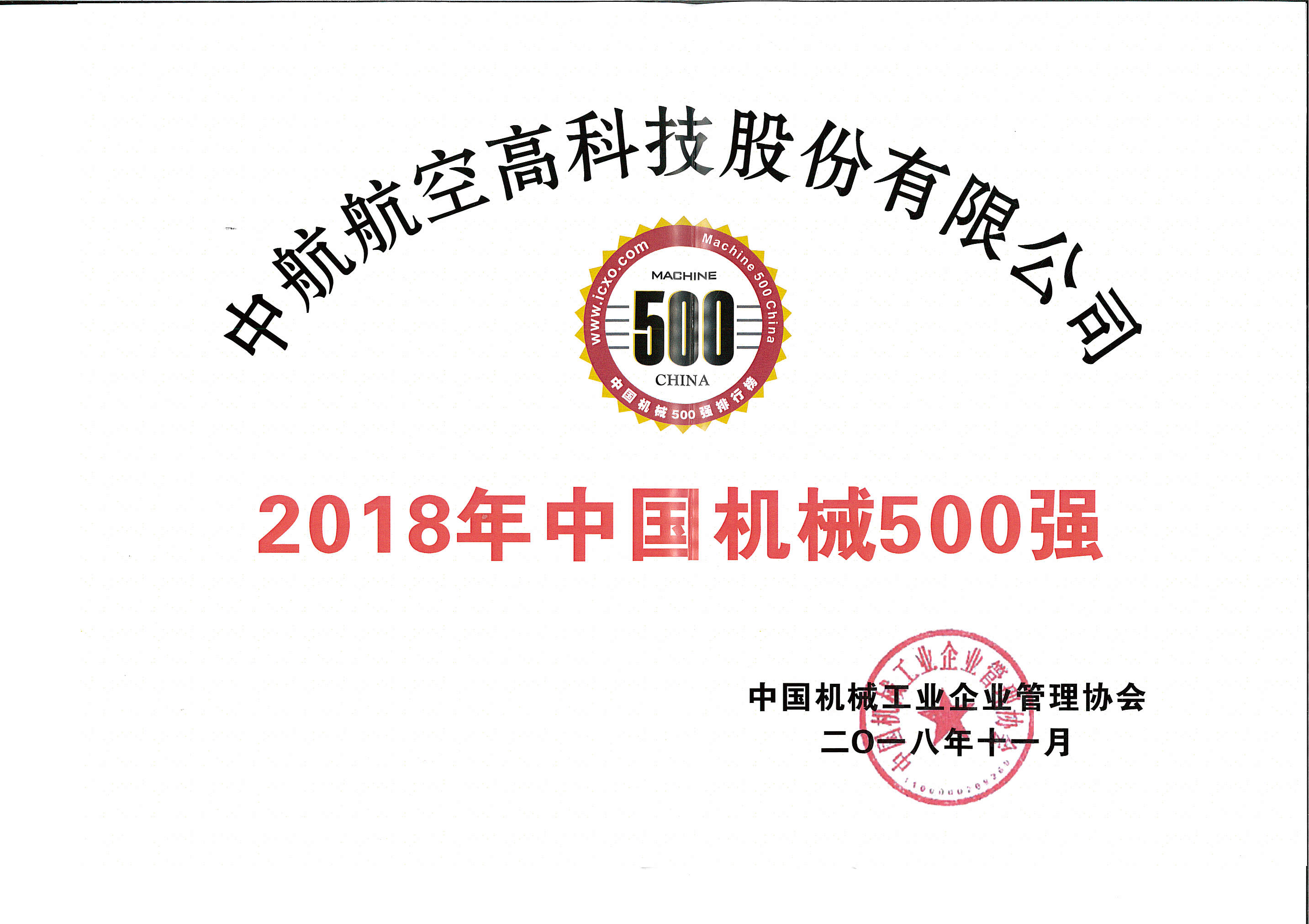 中航高科榮獲“中國(guó)機(jī)械500強(qiáng)”榮譽(yù)稱號(hào)