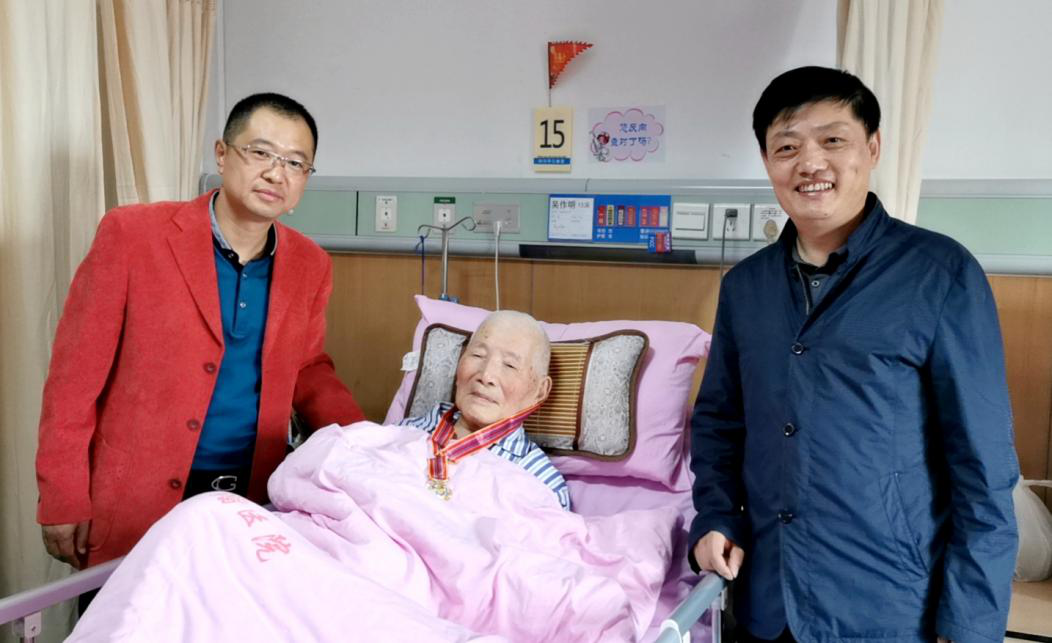 原糖煙酒總公司93歲高齡的離休老干部徐振德老人與大家一起回顧了抗美援朝的親身經(jīng)歷,講述了他親身經(jīng)歷槍林彈雨、九死一生后對戰(zhàn)爭殘酷性的深刻認識,使人深受感動。 原煤炭公司94歲高齡的離休干部吳作明老人,因身體原因平時神智有些不清楚,但當看到慰問人員來看望并給他送抗美援朝紀念章時,神情一下子清醒過來,十分激動地向大家舉手示意,眼里充滿感激淚花。