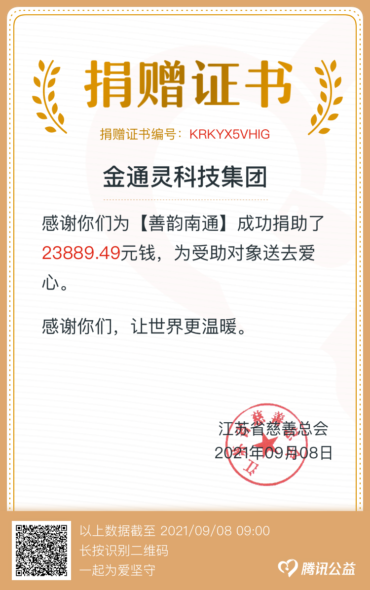 近日,我市組織開展“博愛在南通 慈善暖江?!?span>慈善一日捐活動(dòng),金通靈積極響應(yīng)產(chǎn)控集團(tuán)的號(hào)召,第一時(shí)間組織開展一日捐活動(dòng)。截止到9月8日,金通靈共籌得善款23889.49元,募集資金將統(tǒng)一交至南通市慈善總會(huì),繼續(xù)用于扶貧、慈善救助項(xiàng)目。