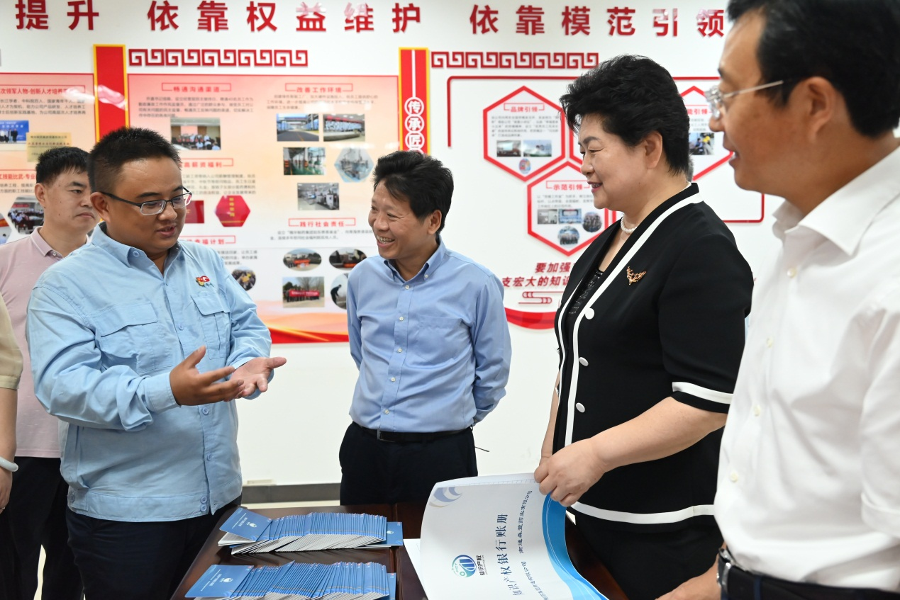 公司董事長(zhǎng)、總經(jīng)理袁擁軍代表公司全體員工對(duì)蔡毅德一行表示熱烈的歡迎,并陪同參觀了公司黨群活動(dòng)室、產(chǎn)改工作室,詳細(xì)介紹了在公司“五彩黨建”引領(lǐng)下,以“五個(gè)依靠、五心工程”為抓手開展的一系列產(chǎn)改工作。袁擁軍匯報(bào)了公司近年來在黨建工作、生產(chǎn)經(jīng)營、科技創(chuàng)新、人才培養(yǎng)、產(chǎn)業(yè)工人改革等方面取得的優(yōu)異成績(jī)。調(diào)研過程中,來訪人員饒有興趣的了解了公司 “員工幸福計(jì)劃”、“知識(shí)產(chǎn)權(quán)銀行”制度、“青藍(lán)工程”等亮點(diǎn)工作和做法,并給予高度肯定。袁擁軍向來訪人員贈(zèng)送了由公司黨員和管理骨干開展讀書征文活動(dòng)編撰的 “單位如家、感恩有我”、“奮斗如歌”、“責(zé)任如磐、攻堅(jiān)有我”系列叢書。