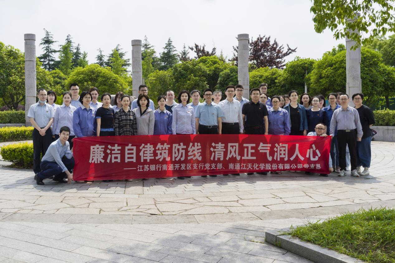 5月22日下午,江天化學黨支部與江蘇銀行南通開發(fā)區(qū)支行黨支部攜手共赴南通廉潔文化廣場,開展“廉潔自律筑防線 清風正氣潤人心”主題黨日共建活動。江天化學支部書記、副總經(jīng)理張永鋒,支部副書記、副總經(jīng)理沙曉東,支部委員、副總經(jīng)理史彬,江蘇銀行南通開發(fā)區(qū)支行黨支部書記、行長孫晴等出席活動。
